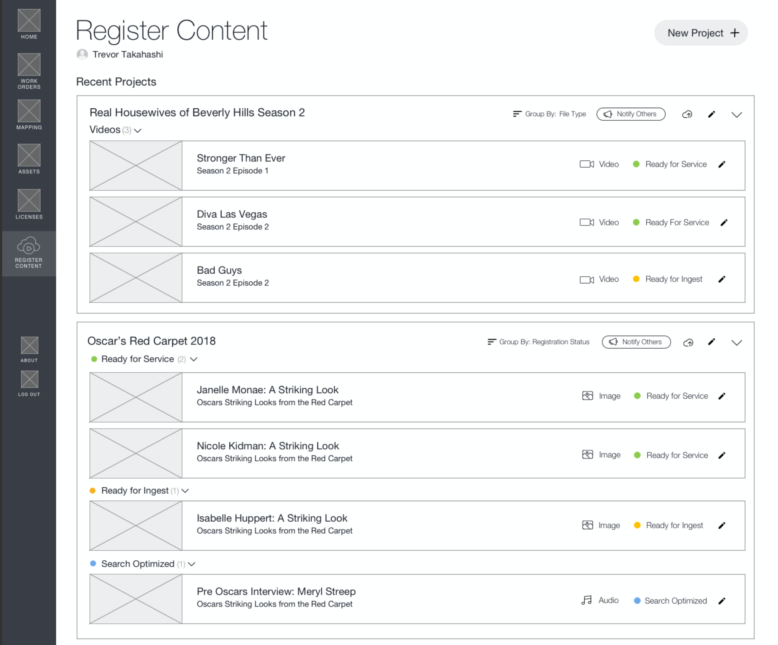 Homepage of the MAM: Users can see their latest projects and group files either by file type or registration status. Depending on how much metadata the user inputted when registering an asset, the file can be marked as Ready for Service, Ready for Ingest, or Search Optimized. Stage-based (ingest, proxy, servicing) metadata editing with progress state was an idea from our ideation session. Ready for Ingest is the bare minimum metadata for the asset to exist in the system. Ready for Service means that the asset is usable. Search Optimized means that the asset can easily be searched for in the MAM.