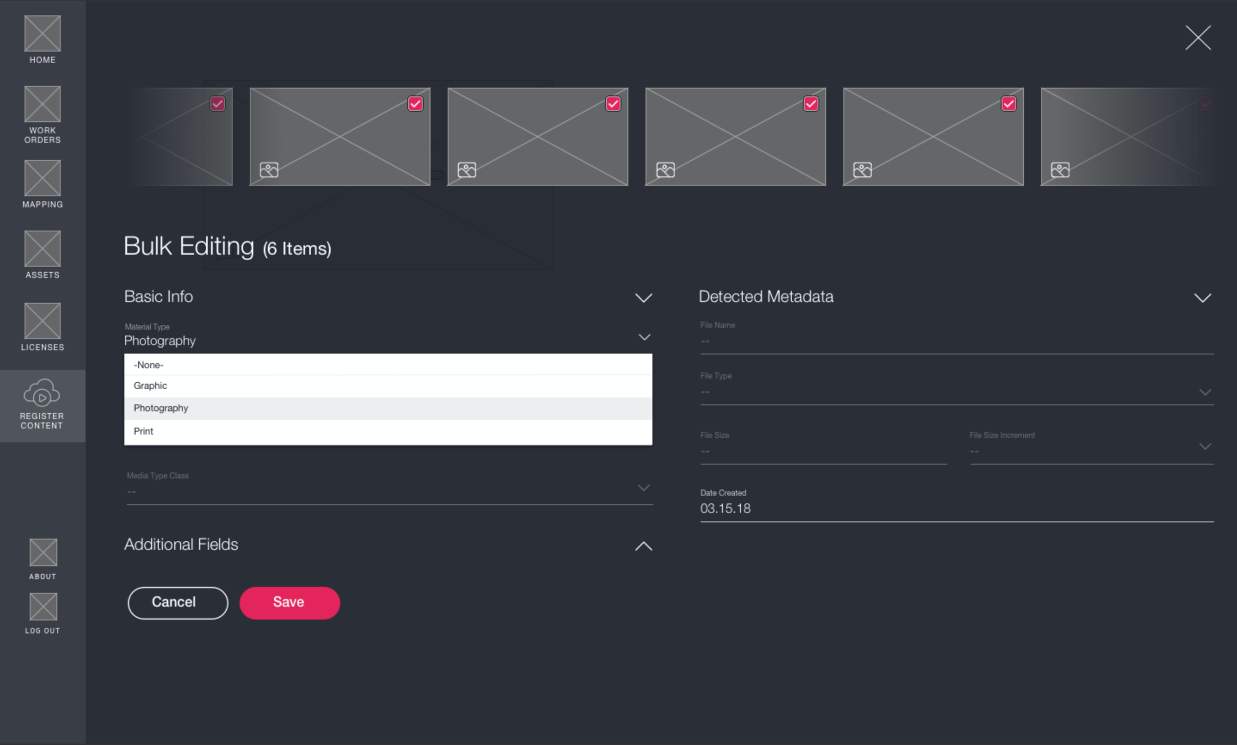 We added a new masonry grid view since users wanted a bigger preview of the content without having to click into the file. With the new masonry grid and the regular list row format, users can now collapse and re-arrange cards around to customize their view of their landing page and metadata forms. Required fields are now indicated on the metadata forms. We also created the concept of file asset shells where users with metadata beforehand can input them into the system before they upload the assets since that scenario occurs pretty frequently. View the experience mapping from the second testing here.